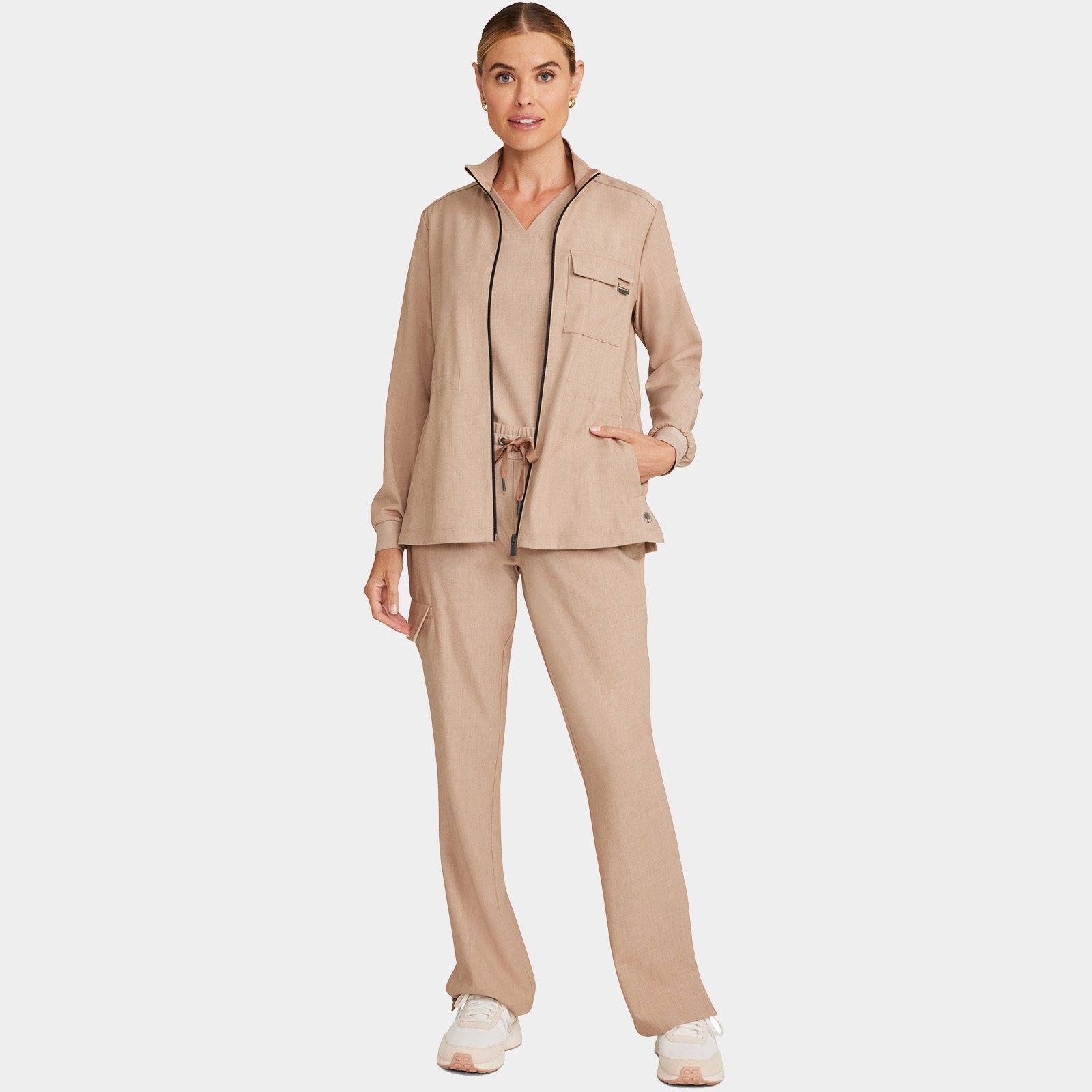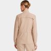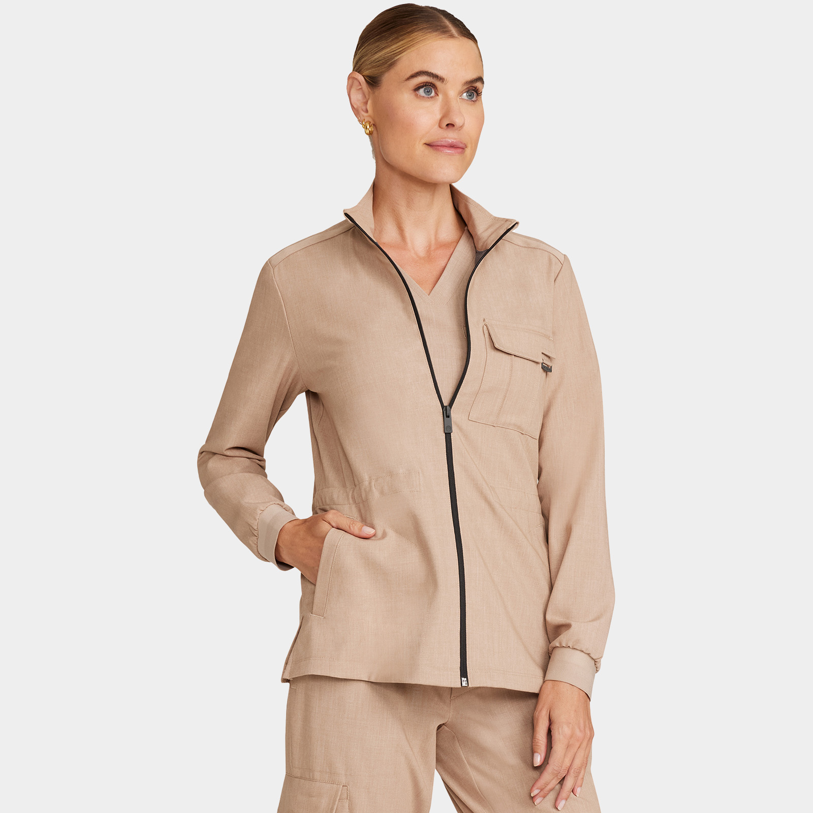 Perfect for work-to-weekend wear, the Brooks zip front jacket boasts exceptional design details. There is a logo zipper pull, stand-up collar, grosgrain ribbon trim on the shoulder seams, and patterned elastic sleeve cuffs. This utility jacket is partially lined with knit on the inside front and back yoke to guard against cool days and chilly hospitals. There are four pockets for stylish storage: one pintucked chest pocket with flap and logo D-ring, two front welt pockets, and one cell pocket on the inside left. Exterior pockets have pretty printed pocket bags. Adjust the waist using the bungee cord and toggles for a customizable fit. The curved back yoke provides a better fit across the shoulders. Side vents at hem for ease of movement. The soft four-way stretch fabric includes moisture wicking for added comfort. Modern fit. Center back length (size Small): 26″